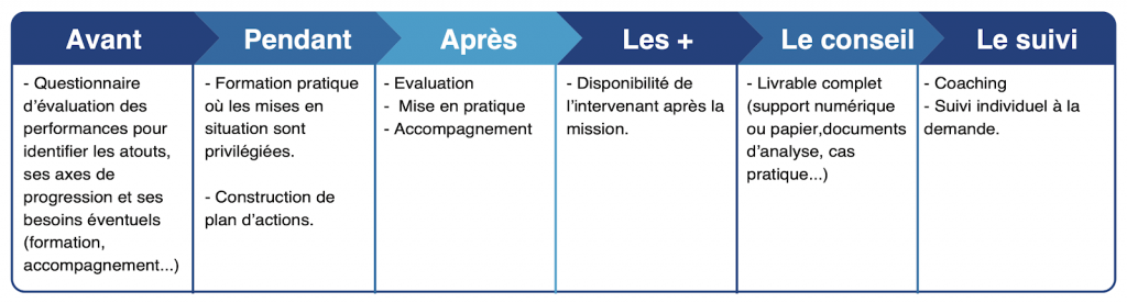 Pour les différents projets notamment, les formations continues, les projets d’amélioration continue, d’accompagnement organisationnel, de diagnostic stratégique ou d’ingénierie de formation, nous adaptons nos méthodes et nos démarches en fonction des projets pris en charge.